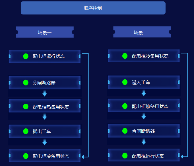 智能一键顺控:针对非电机、电机、进线等不同回路,自动判断断路器、手车地刀状态是否满足动作条件,实现运行/热备用转检修、检修转供电/热备用等场景的一键顺序化遥控操作;