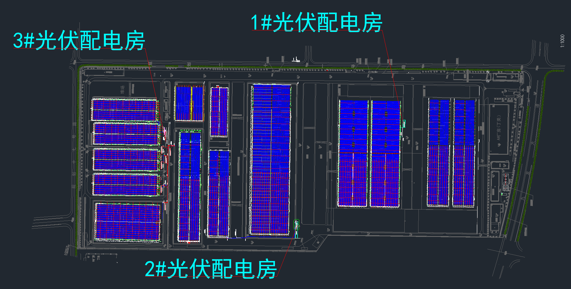 项目共设置三个光伏配电房,每个配电房安装550Wp单晶单面组件10909块,装机容量5999.95kWp,项目总装机容量达18MW。逆变器选用1500V系统组串式逆变器,容量为225kW,三个配电房共计配备85台(1#配电房30台、2#配电房28台、3#配电房27台)。