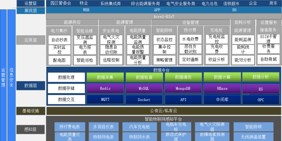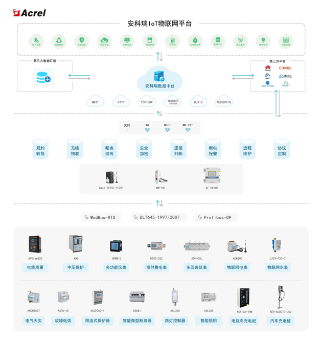 ● 感知层:连接于网络中的各类传感器,包括多功能仪表、预付费电表、多回路仪表、物联网电表、物联网水表、电瓶车充电桩、汽车充电桩、路灯控制器等。